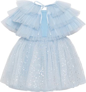 Sleeveless Sparkle Dress Set combines elegance and comfort for little princesses. With its silver foil printed skirt and strappy design, this set offers shining elegance in every movement. The cape enhances the elegance with elegant layered ruffle details.