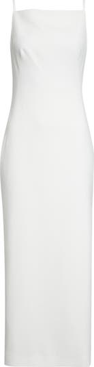 This sleek column dress crafted in Italy from crepe cady is sculpted with V-shaped seams in back for a smooth fit and cut with a high, wide square neckline for a sophisticated look.