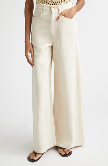 Undyed ecru denim with earthy flecks brings nuanced color and textural depth to these nonstretch wide-leg jeans refined with OSSOU’s signature mixed‑metal hardware.