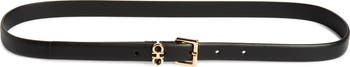 Polished Gancio hardware brands the keeper of a smooth calfskin belt done in a slim design.