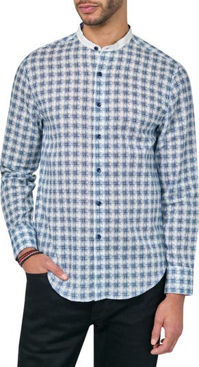 Brooklyn Brigade Slim Fit Check Print Linen Cotton Banded Collar Long Sleeve Shirt, Alternate, color, Blue