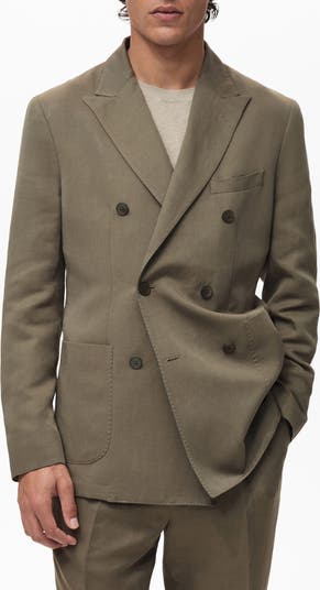 An earthy hue brings eye-catching appeal to a dapper double-breasted suit jacket cut in a slim fit for a sharp, streamlined look.