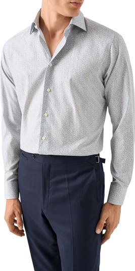 Tiny flowers scatter in foggy greys and blues on a dress shirt tailored from crisp Italian-cotton twill with cuffs that flip from barrel styling to French and a finish that complements any semiformal outfit. The lower hem stays securely tucked and the non-iron fabric resists creases and wrinkles to keep you looking smart, even when you travel.