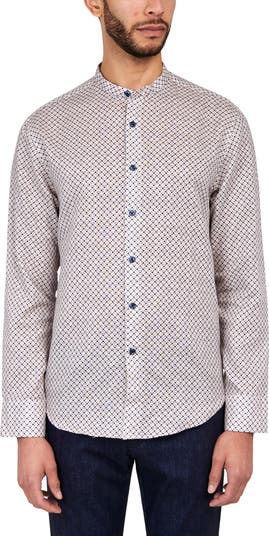 Slim Fit Geo Linen Cotton Banded Collar Long Sleeve Shirt