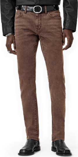 An earthy hue brings versatile style to these slim-fitting jeans and makes them a nice change from typical denim colors.