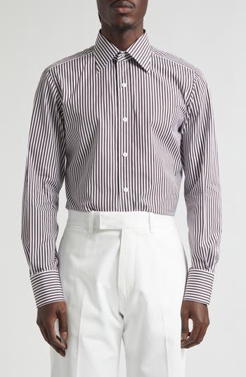 Neat stripes pattern this wardrobe-essential button-up cut from crisp, breathable cotton in a slim-fit silhouette with a slightly elongated hem designed to stay tucked in.
