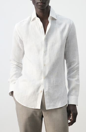 Breathable linen brings superior comfort to this button-up shirt cut in a slim fit and punctuated with a tuckable hem.
