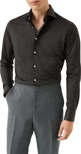 Cut in a slim fit, this sharp dress shirt is constructed from high-performance, crease-resistant Merino wool and fitted with a classic spread collar.