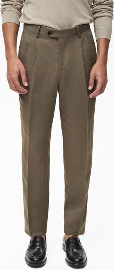 A breezy linen blend lends warm-weather charm to slim-fit dress pants fashioned with neat pleats at the front and the back.