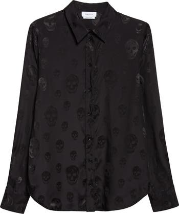 McQueen's macabre edge reigns supreme in this slim-cut shirt, where mixed-scale skulls float against an inky canvas of fluid, lightweight crêpe de Chine.
