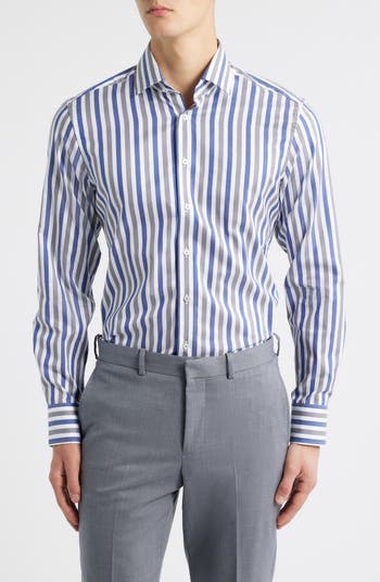 Tailored from crisp cotton twill and patterned in smart stripes, this wrinkle-resistant dress shirt makes a bright addition to your semiformal and elevated-casual wardrobes. It pairs well with solid fabrics, but there's always room for mixing patterns and colors to define your personal look.