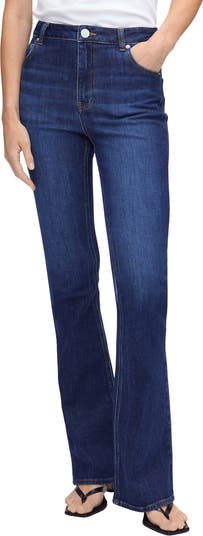 Create an elongated look in these slimmed-down, full-length flare jeans made from low-stretch organic-cotton denim in an everyday dark wash.