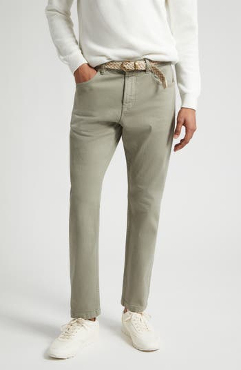 Stretch-kissed denim and a clean-lined design offer unparalleled versatility and comfort in slim-leg jeans with classic five-pocket construction.