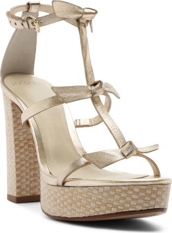 A towering block heel and platform wrapped in woven raffia add to the textural dimension of this metallic-leather sandal that features a laddered, strappy silhouette accented with signature Clarita bows.
