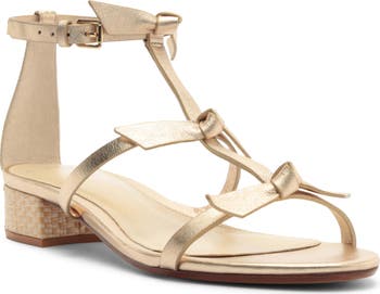 A low block heel wrapped in woven raffia adds to the textural dimension of this metallic-leather sandal that features a laddered, strappy silhouette accented with signature Clarita bows.