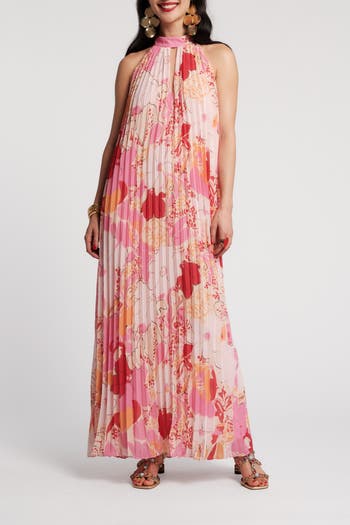 Maxi flowy pleated dress with key hole adornment in the middle of the chest|Floral Print|Mock neck detail and sleeveless dress|Fabric 100%Polyester| Lining 97% Polyester, 3% Spandex