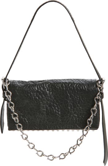 Brushed-metal trapezoidal studs—a new icon in Wang's detailing toolkit—punctuate the bottom of this slimmed-down version of the Ricco shoulder bag made from richly grained lambskin leather. A removable shoulder strap and chain handle with bent-nail links offer carrying options.