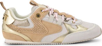 Mixed leather-and-suede panels with heart-shaped perforations bring graphic character to this low-profile sneaker finished with a bold logo heel tab and cushioned EVA footbed.
