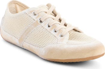 Softly burnished calfskin accents contrast the open-knit cotton upper of this streamlined sneaker subtly emblazoned with the house's iconic logo extending along the sides.