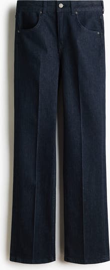 Jeans in denim with a slight stretch for good comfort. Straight leg with a regular fit from the waist to the thigh and a narrow, straight cut from the knee to the hem. High waist with a zip fly and button. Pockets at the front and back, creases down the front and a slit at the back of the hems. Regular length, designed to hit the top of the foot with little or no stacking.
