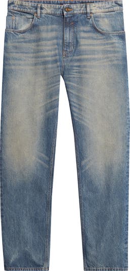 Heavily faded nonstretch denim contributes to the vintage-inspired feel of slim-fitting jeans cut in a straight-leg silhouette.