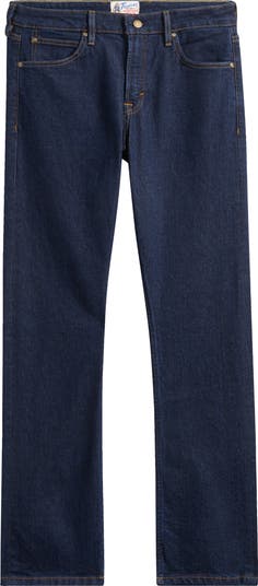 Trim through the hips and thighs, these classic dark jeans made of cotton and recycled plastic bottles feature a straight-leg profile that fits over your favorite boots and also looks great with sneakers. The ultrasoft denim sports plenty of built-in stretch for comfort, while the leather patch on the back comes plain so you can brand it for a custom finish.