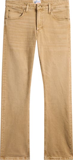 Trim through the hips and thighs, these American-made jeans washed in a faded tan feature a straight-leg profile that fits over your favorite boots and also looks great with sneakers. The ultrasoft denim sports plenty of built-in stretch for comfort, while the leather patch on the back comes plain so you can brand it for a custom finish.
