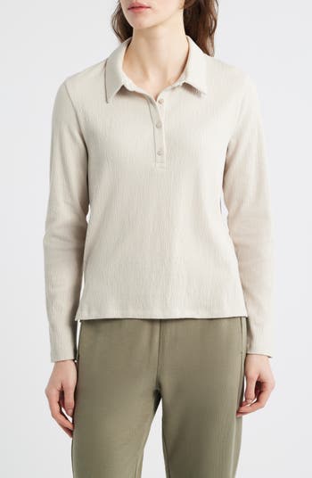 Stretch-enhanced organic cotton covered in a rich texture clings to your curves in this easygoing henley that's rendered in a solid hue for easy, everyday pairing.