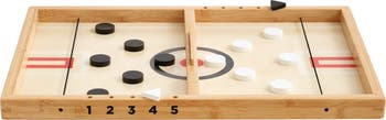 This hockey game can be played on tables, counters, beds and the floor, making it perfect for nightly fun or when traveling. It comes with six black and six white pucks, two different center gates to increase or decrease difficulty level, and two scorekeepers. Simply pull back the elastic behind your puck and let it fly.