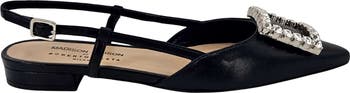 IF YOUR FOOT IS A BIT WIDER GO UP 1/2 SIZE. Italian leather slingback flat by Madison Maison with a pointed toe, low heel, and large rectangular crystal-embellished buckle on the front. Handcrafted in Italy with adjustable slim strap.