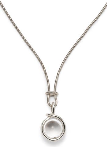 A faceted crystal quartz catches the light, bringing a clear, luminous shine to an elegantly sculpted pendant suspended lariat style from a serpentine chain.