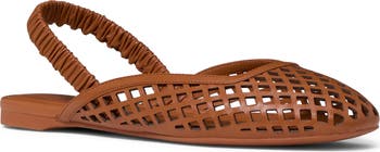 Laser-cut perforations and a square-cut topline amplify the dimension of a streamlined mule shaped from rich leather and secured by an elasticized slingback strap.