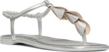 Glinting hardware and scalloped overlays enrich the minimalist profile of a metallic leather sandal secured by a center toe post and elasticized slingback strap.