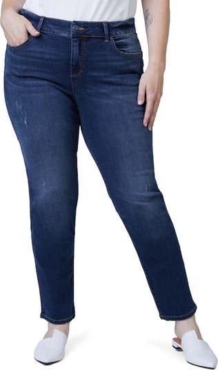 Soft and slim-fitting, these flattering mid-rise jeans are designed in a faded indigo wash with subtle distressing.
