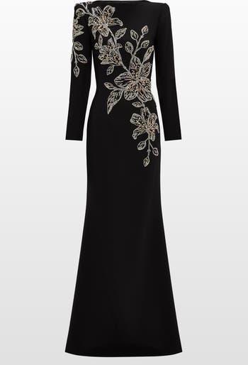 Introducing Slipper Orchid a statement piece that combines striking embellishment with sleek sophistication. The fitted silhouette features long sleeves and a boat neckline, while bold floral beaded embroidery cascades across the bodice and skirt, creating a dramatic, sculptural effect. The clean lines and fluid shape make this gown an elegant choice for occasions that call for modern glamour with artistic flair.