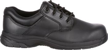 This ROCKY® SlipStop 911 Plain Toe Oxford will look great on you. The upper of this black public service shoe is full-grain leather that's water resistant. The exterior was left unadorned so that this shoe will blend well with your uniform. The interior lining is made from a brushed textile. While it feels soft, its breathability keeps the inside of the men's oxford fresh and airy. The contoured cushioned insole keeps your feet comfortable. This black oxford has a Rocky 911 SlipStop outsole. The outsole offers you oil and slip resistance, and stitching around the toe and heel enhances the public service shoe's durability. If you've been looking for a men's shoe that has enough strength to last, but provides enough cushioning to keep your feet comfortable, this work shoe is the right choice for you.
