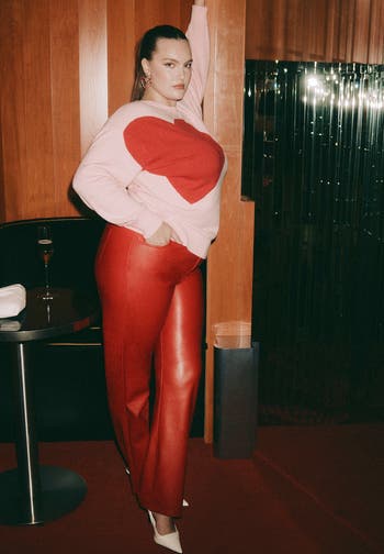 A sleek faux-leather flare with slit hems, belt loops, and an extra-long 33" inseam.