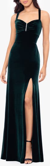 Show a little leg in this elegant evening-out gown crafted from sumptuous velvet with pearly beads and a daring front slit.