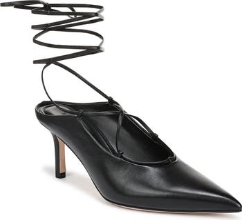 Slender leather laces crisscross the deep-cut vamp and wrap around the ankle, bringing a seductive element to this pointy-toe mule pump lifted by a classic stiletto.