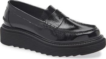 A thick platform sole modernizes the classic silhouette of this penny loafer crafted from patent leather and styled with a classic moc toe.