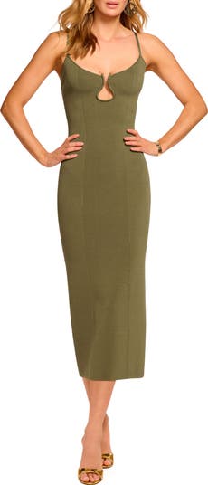 A classic fitted midi dress—eased with rib stitching—gets a daring update with sculptural U-hardware creating a plunging cutout at the scooped neckline.