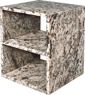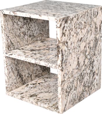 Add a touch of Bohemian chic to any space with our natural marble side table. The square, modern shape is divided into shelves for storage. Use a pair of them in the bedroom or living room, or line up several to create a chic contemporary shelving unit.