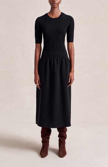 This bestselling combo dress features a fitted knit bodice with elbow-length sleeves and a crepe midi skirt with soft ruching—an easy, polished day-to-night style.