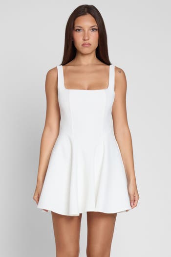 Crafted from premium crepe fabric with internal corset boning, this mini dress features a square neckline with straight straps and a sculpted V shape waistline that creates a flattering silhouette.