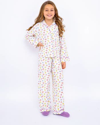 A silky soft multicolor sloth printed jersey loungewear set featuring a long sleeve button-up top and matching pants with elastic waist.