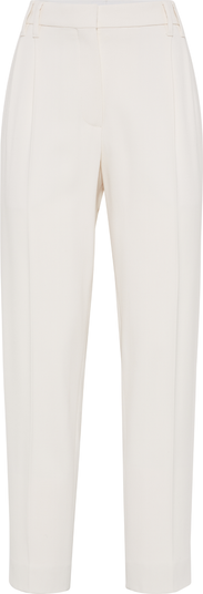 - Zip closure with button, metal hooks and backing buttonFront pocketsBack pocketsDouble pleatNickel-free monili decoration