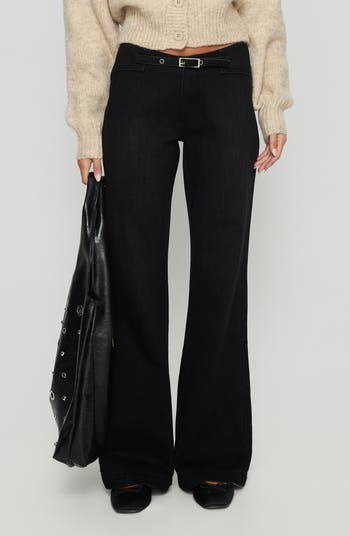 Elevate your denim outfits with these stretchy, bootcut jeans featuring an attached D-ring belt and a crisp dark wash.