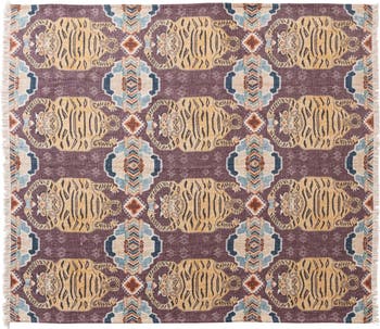 - A cotton slub printed throw, featuring a bold Tibetan Tigers pattern in multicolor, accented with fringe for a dynamic, textured finish
