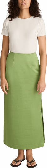 This midi skirt has a Hollywood waist, on-seam pockets, and a side seam slit.