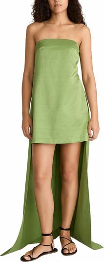 A statement piece. This strapless mini dress with train has an internal corset, an exaggerated high-low skirt, a pleated back, and a side seam zip. In an Italian fabric with a slub sateen finish in green.